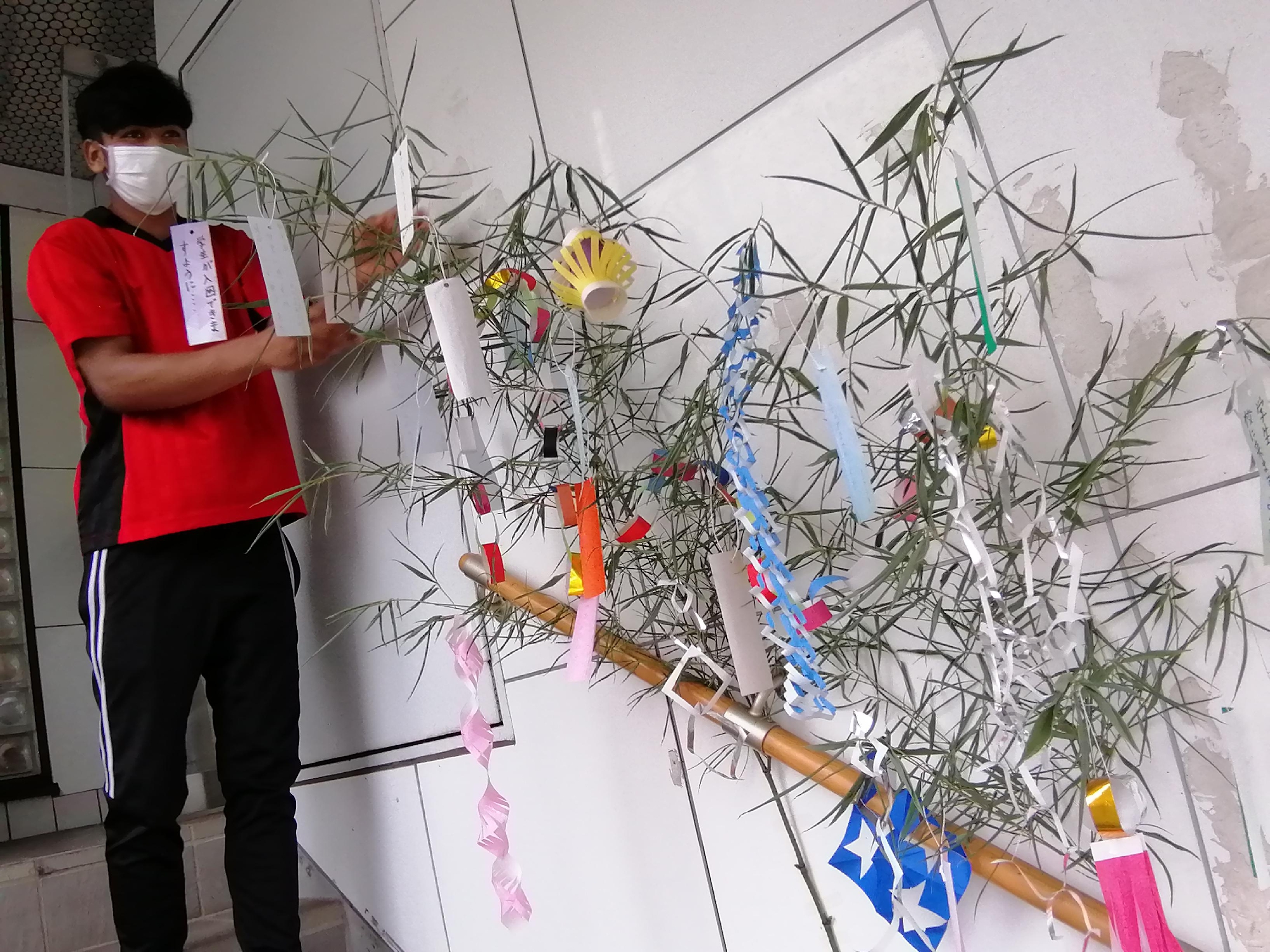 7/7 七夕飾りを作りました。 「お金持ちになりたい」「家族が幸せに‥」など、色々な短冊のお願いごとの中、「入国できていない学生が入国できますように…」というお願いもありました